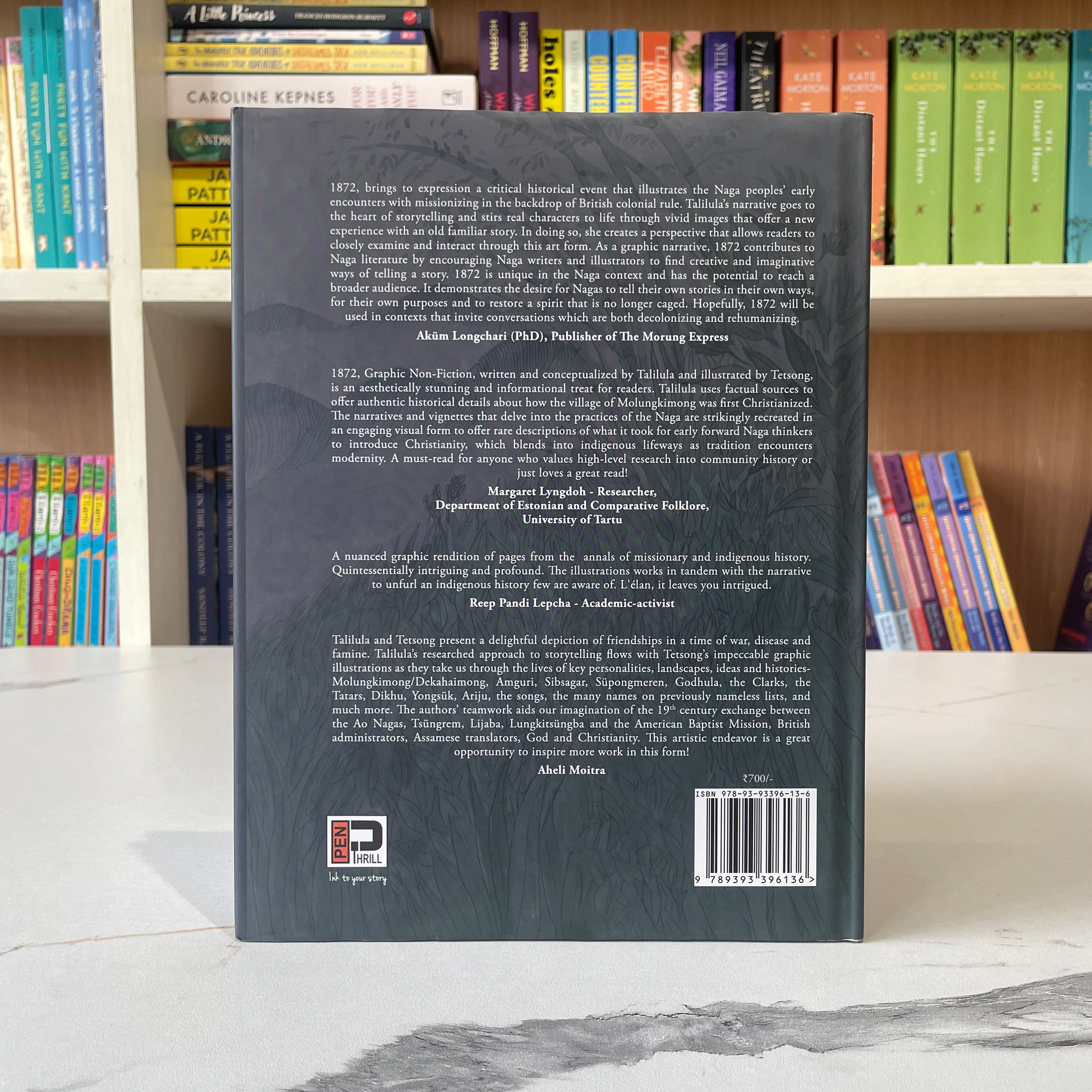 1872, brings to expression a critical historical event that illustrates the Naga peoples' early encounters with missionizing in the backdrop of British colonial rule. Talilula's narrative goes to the heart of storytelling and stirs real characters to life through vivid images that offer a new experience with an old familiar story. In doing so, she creates a perspective that allows readers to closely examine and interact through this art form. As a graphic narrative, 1872 contributes to Naga literature by encouraging Naga writers and illustrators to find creative and imaginative ways of telling a story. 1872 is unique in the Naga context and has the potential to reach a broader audience. It demonstrates the desire for Nagas to tell their own stories in their own ways, for their own purposes and to restore a spirit that is no longer caged. Hopefully, 1872 will be used in contexts that invite conversations which are both decolonizing and rehumanizing. - Aküm Longchari (PhD), Publisher of The Morung Express
