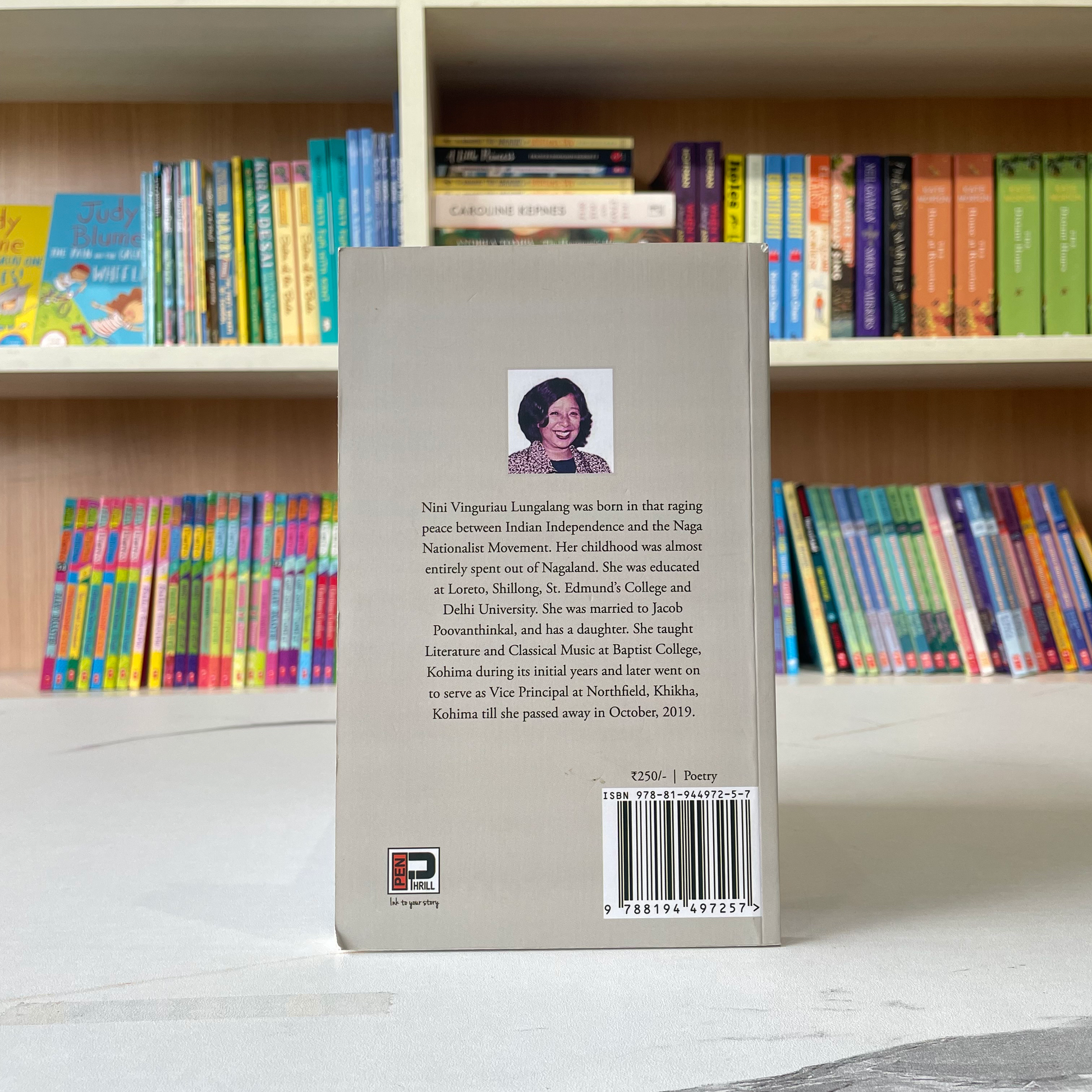 Nini Vinguriau Lungalang was born in that raging peace between Indian Independence and the Naga Nationalist Movement. Her childhood was almost entirely spent out of Nagaland. She was educated at Loreto, Shillong, St. Edmund's College and Delhi University. She was married to Jacob Poovanthinkal, and has a daughter. She taught Literature and Classical Music at Baptist College, Kohima during its initial years and later went on to serve as Vice Principal at Northfield, Khikha, Kohima till she passed away in October, 2019.
